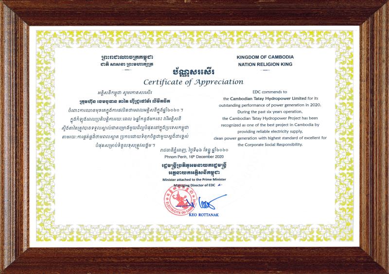 12月16日,为表彰中国重机投资运营的柬埔寨达岱水电站2020年超额完成设计发电量,连续多年为柬埔寨经济社会发展提供清洁、优质电力能源做出的突出贡献,柬埔寨国家电力公司(下称EDC)授予柬埔寨达岱水电站“发电卓越奖”。