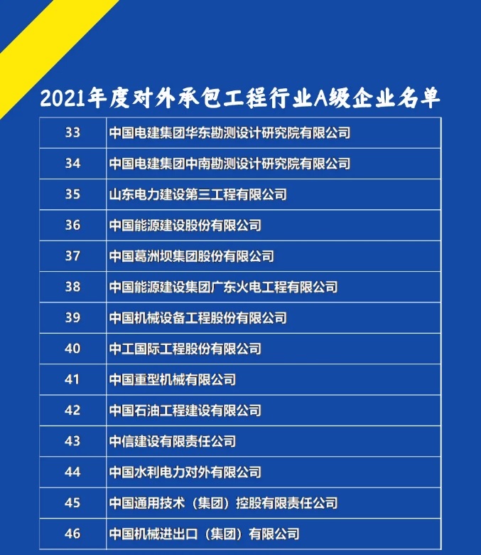 该名单是商会根据《对外承包工程企业分级框架标准(行业标准)》,综合考量会员企业业绩、实力、专业资质和行业信用等级等因素,经商会行业规则委员会各单位委员评审确定,并经行业内公示产生的。2021年度共有79家企业获评A级企业。