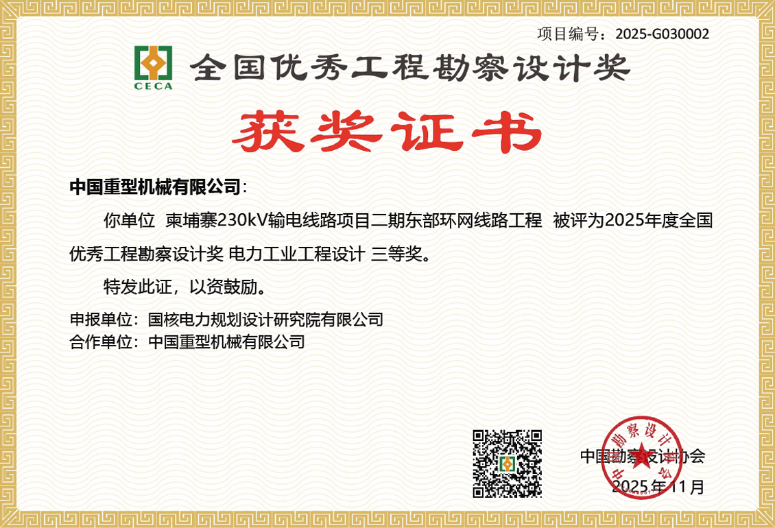 近日,在2025年度全国优秀工程勘察设计奖评选活动中,由中国重机承建的柬埔寨230kV输电线路项目二期东部环网线路工程,凭借卓越的设计水准与工程质量,荣获电力工业工程设计类三等奖。